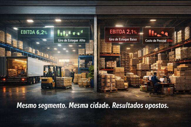 Não é hipótese. É o que os dados mostram toda vez que colocamos empresas do mesmo porte lado a lado. Duas distribuidoras de alimentos. Mesma região. Faturamento parecido. Uma opera com EBITDA de 6,2%. A outra, com 2,1%. A diferença não está no mercado — está dentro da empresa. Quando perguntamos ao dono da segunda…